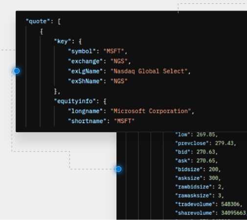 We also deliver market data and research in our JSON Financial Data APIs. This allows you to easily integrate our data into your web products. For javascript developers, JSON is natively supported and pluggable into AJAX for dynamically updating HTML5 applications. Read More
