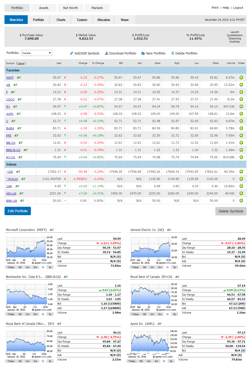 Attract and retain website users by providing them the power of QuoteMedia's Web Portfolio Management applications, easily implemented and customized in your site.